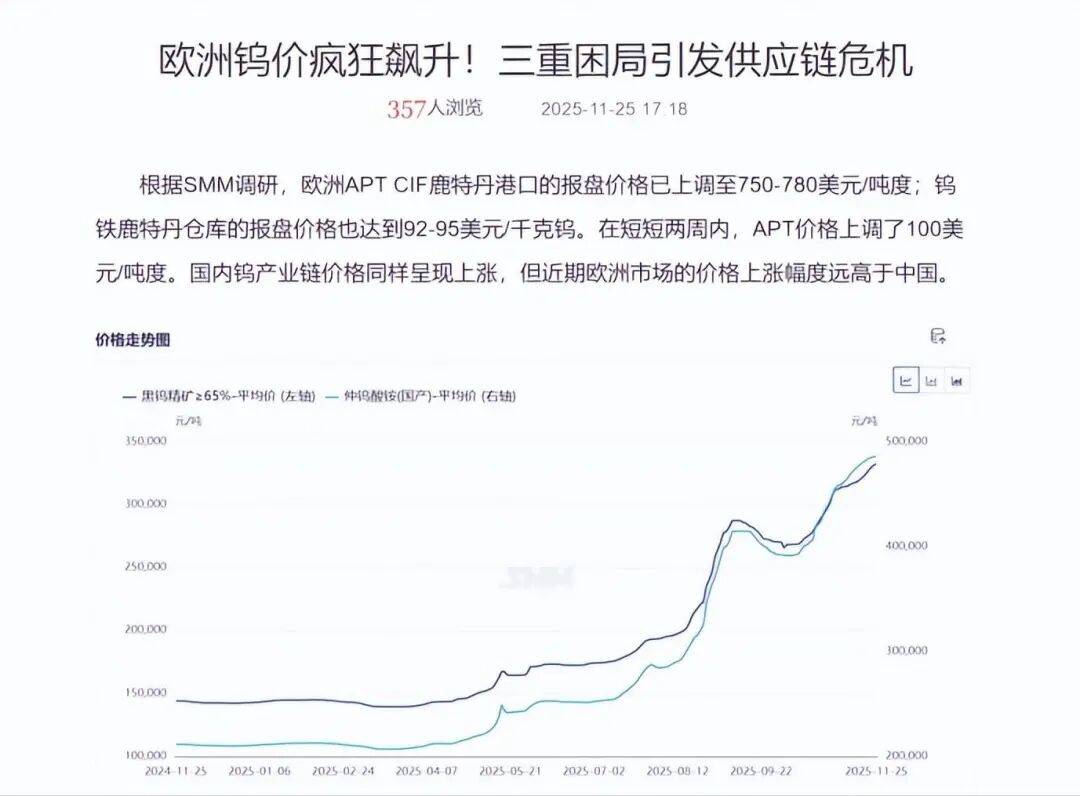 自1991年起,中国就将钨列为国家保护性开采矿种,限制无序开采,保障了钨资源的合理开发与利用。2025年,钨的“王者地位”被彻底激活,这源于中国供应收紧和需求爆发。2025年2月4日,中国对钨、碲、铋、钼、铟实施出口管制后,中国钨APT出口量从2024年的782吨骤降至2025年前11个月的243吨,降幅达70%。截至2025年11月,黑钨精矿均价涨到33.1万元/吨,年内涨幅超132%,钨粉价格从年初32.2万元/吨飙升至109万元/吨,涨幅远超同期金银铜。