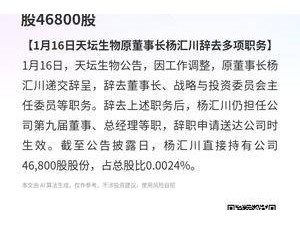 - 天坛生物人事变动:原董事长杨汇川辞任部分职务 仍持46800股股份