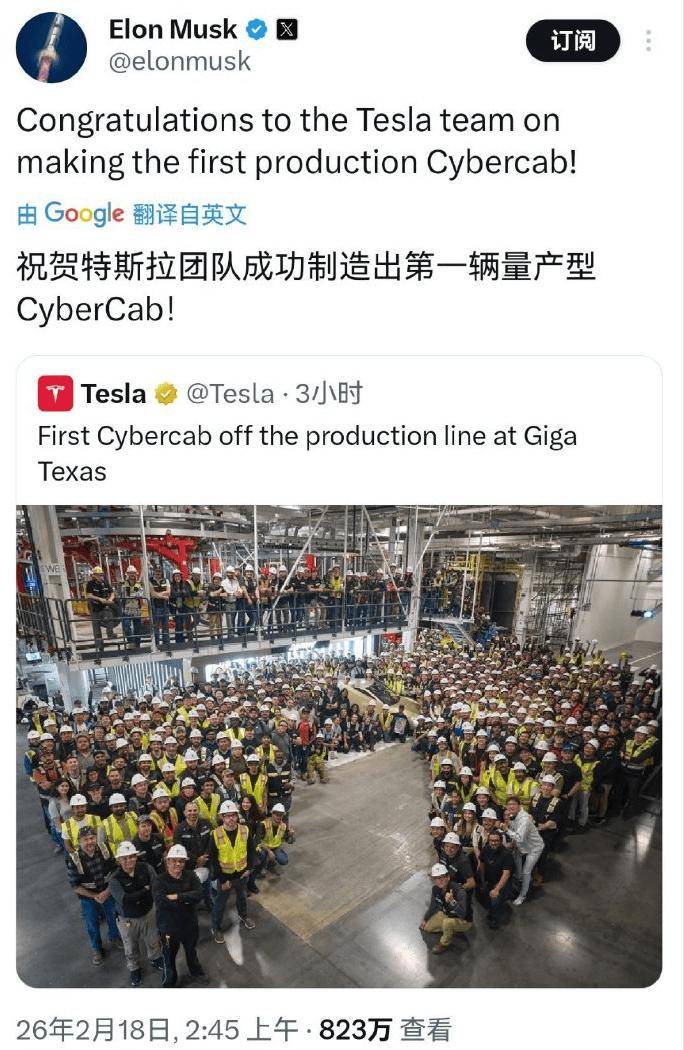 特斯拉在美国得州超级工厂迎来重要里程碑——首辆量产型Cybercab正式下线。公司首席执行官埃隆・马斯克通过社交平台发文,向研发团队致以祝贺。这款完全取消方向盘与踏板的车型,标志着特斯拉在无人驾驶出租车商业化领域迈出实质性步伐,全球出行方式或将因此迎来颠覆性变革。