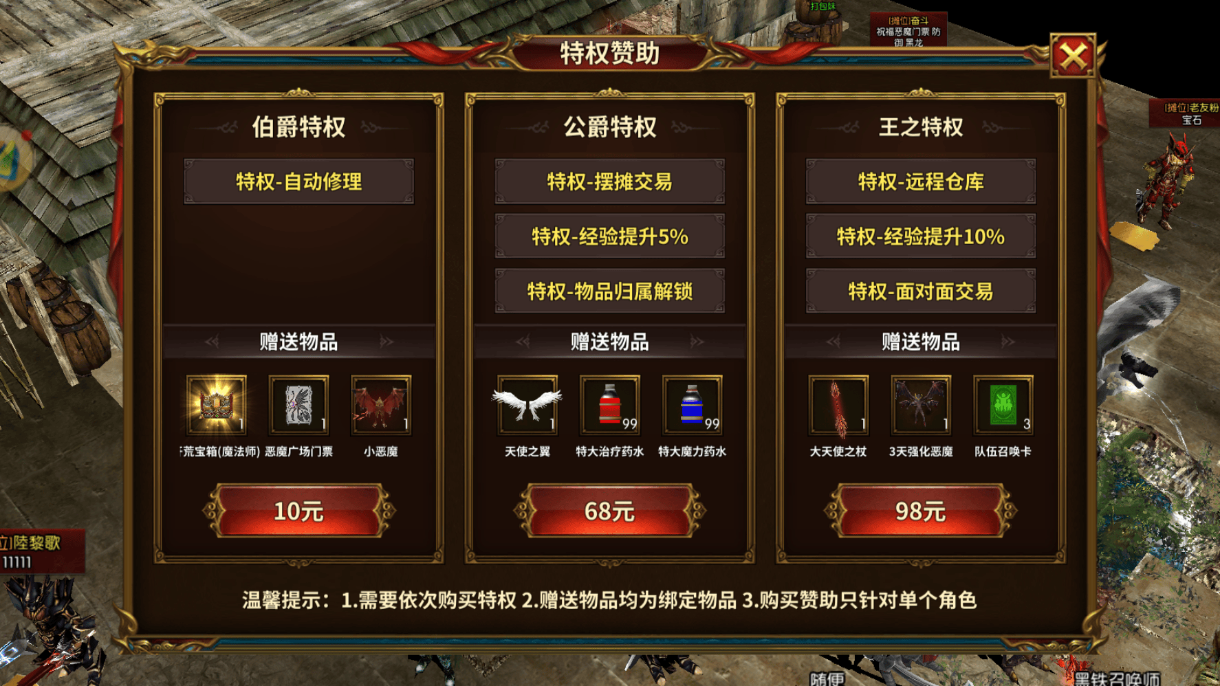 核心玩法涵盖副本、竞技与社交三大板块。四大副本机制各异:恶魔广场需2战士聚怪、4法师清场、4弓箭手辅助,19:00-22:00参与收益翻倍;血色城堡中剑士扛伤、法师清怪、弓箭手治疗,需优先清理挡路小怪;死亡沙漠需触发隐藏传送门进入高爆区域,剑士探路、圣导师召唤天鹰协助;不朽秘境为公会高阶攻坚,需2剑士前排、3法师输出、2弓箭手辅助、2圣导师续航、1魔剑士收割。公平竞技玩法包括1V1/3V3竞技场、世界BOSS争夺与攻城战,胜负取决于操作与配合而非氪金力度。自由社交系统支持公会、师徒、亲密度培养,交易行则允许玩家自由买卖祝福宝石、卓越装备碎片等道具,搬砖玩家可通过组队刷世界BOSS获取稳定收益。