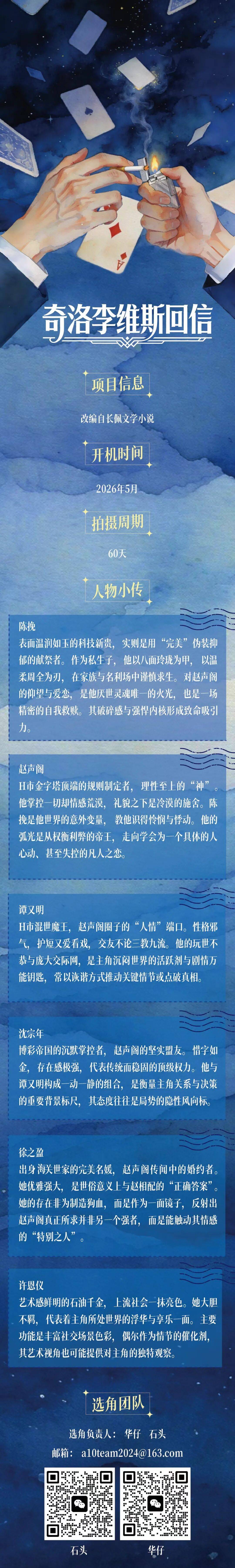 都市治愈剧《奇洛李维斯回信》改编自长佩文学小说,预计5月开机,拍摄周期60天。该剧由华仔和石头担任选角负责人,邮箱为a10team2024@163.com。故事围绕科技新贵陈挽与H市规则制定者赵声阁展开,两人通过书信建立情感联系,在都市中演绎一场治愈之恋。陈挽表面温润如玉,实则用“完美”伪装抑郁;赵声阁理性至上,却在陈挽的影响下逐渐学会心动与失控。选角团队希望通过角色传递出破碎感与强悍内核的致命吸引力。